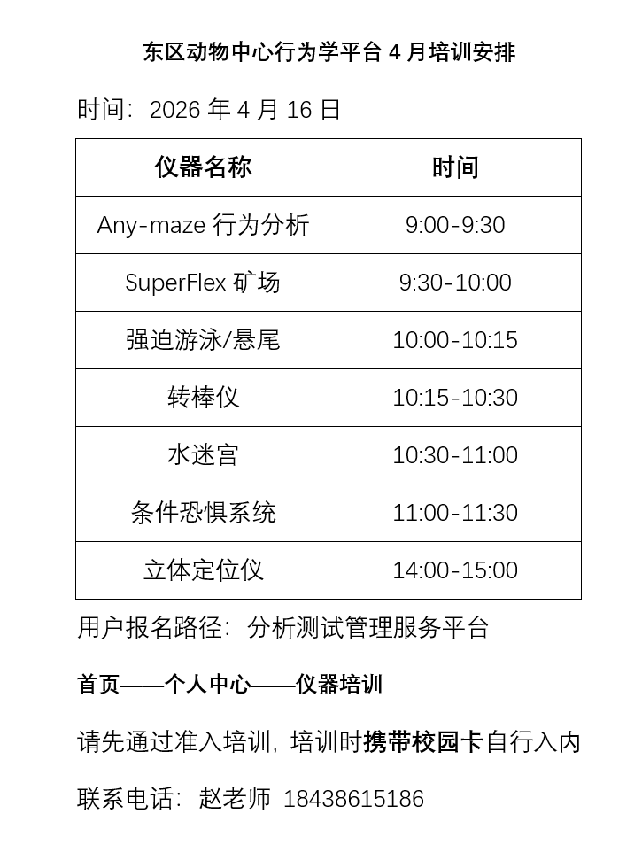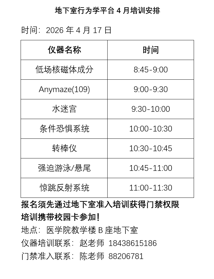 2026年4月东区实验动物中心及医学院地下室行为平台仪器培训通知